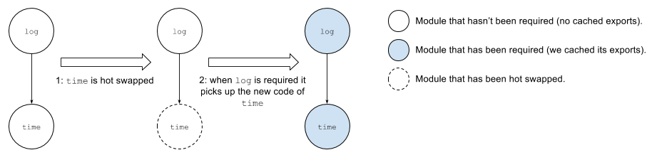 For log to pick up time changes, we'll need to clear its cached exports because one of the modules it depends on was hot swapped (step 3). Finally, when log gets required again, its factory function will get executed requiring time and getting its new code.